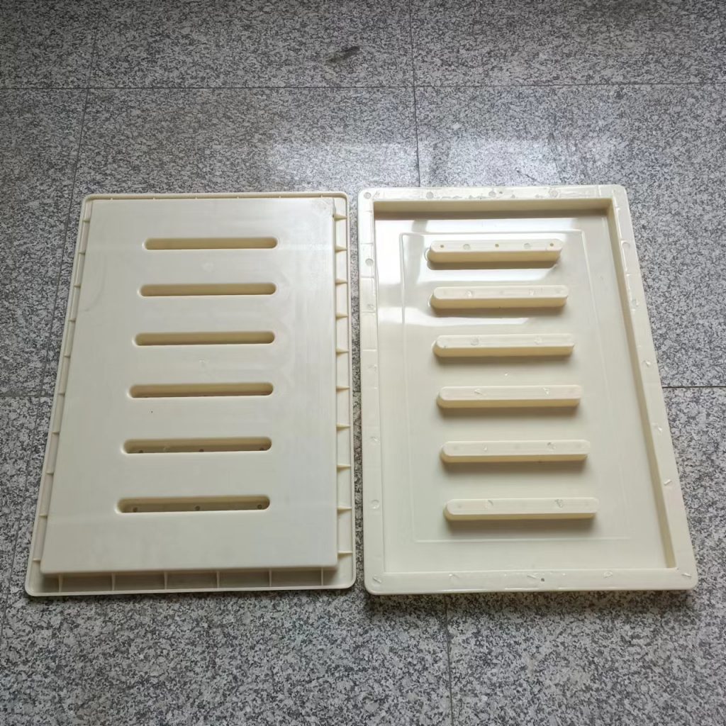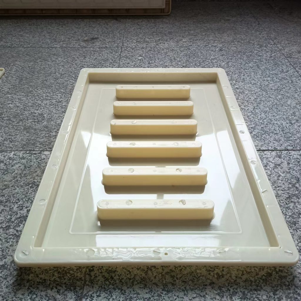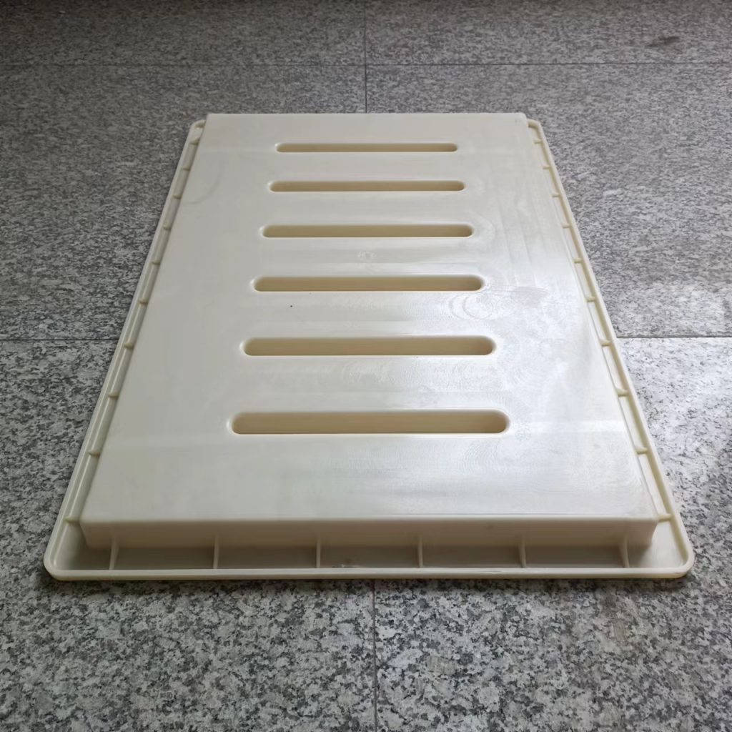 這款塑料雨水蓖模具厚度只有3cm,長寬尺寸為60cm*40cm,他主要用于下水、流水蓋板活性混凝土預制(RPC)預制,他的厚度較薄,與一般材質的雨水蓋模具不同,他采用的材質是ABS材質,這種材質質地比PP材質硬,強度大,使用次數多,這種模具主要預制成型雨水蓋板,普通用于市政道路路面排水使用。他一共有六個排水孔,排水效果很好。水流效果比較好