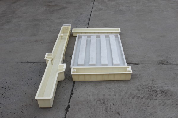 欄片模具則采用PP聚丙烯材質,更好的模具韌性對施工面積較大的水泥制品更為有利。水泥護欄欄片模具的尺寸為149.5×96.5x9cm,采用5幅式欄桿設計。